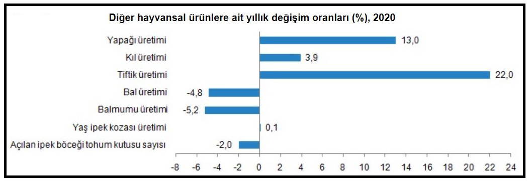 Bu dönemde yapağı üretimi yüzde 13 artarak 79 bin 754 tona, kıl üretimi yüzde 3.9 artarak 6 bin 401 tona ve tiftik üretimi de yüzde 22 artarak 463 tona yükseldi.