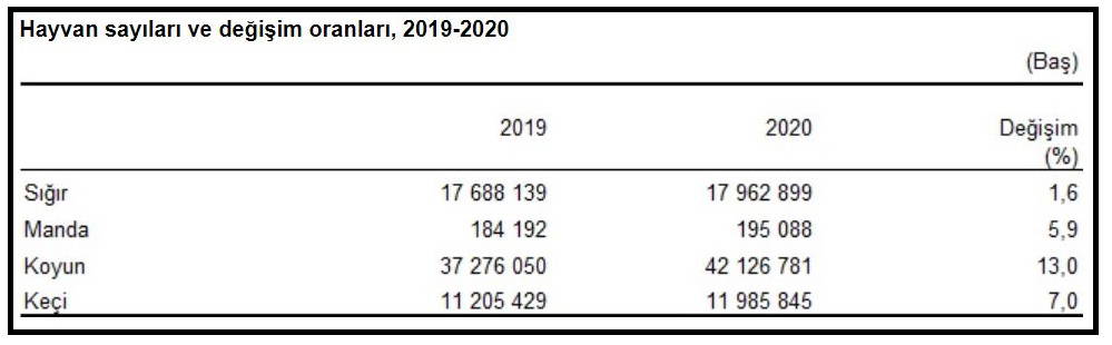 Aynı dönemde, küçükbaş hayvanlar arasında yer alan koyun sayısı yüzde 13 artarak 42 milyon 127 bin başa, keçi sayısı yüzde 7.0 artarak 11 milyon 986 bin başa yükseldi.