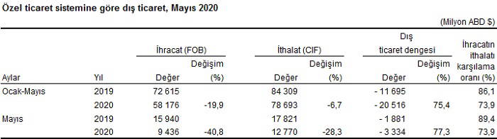 Özel ticaret sistemine göre ihracat, Mayıs'ta yıllık bazda yüzde 40.8 azalarak 9 milyar 436 milyon dolara, ithalat yüzde 28.3 azalarak 12 milyar 770 milyon dolara geriledi.