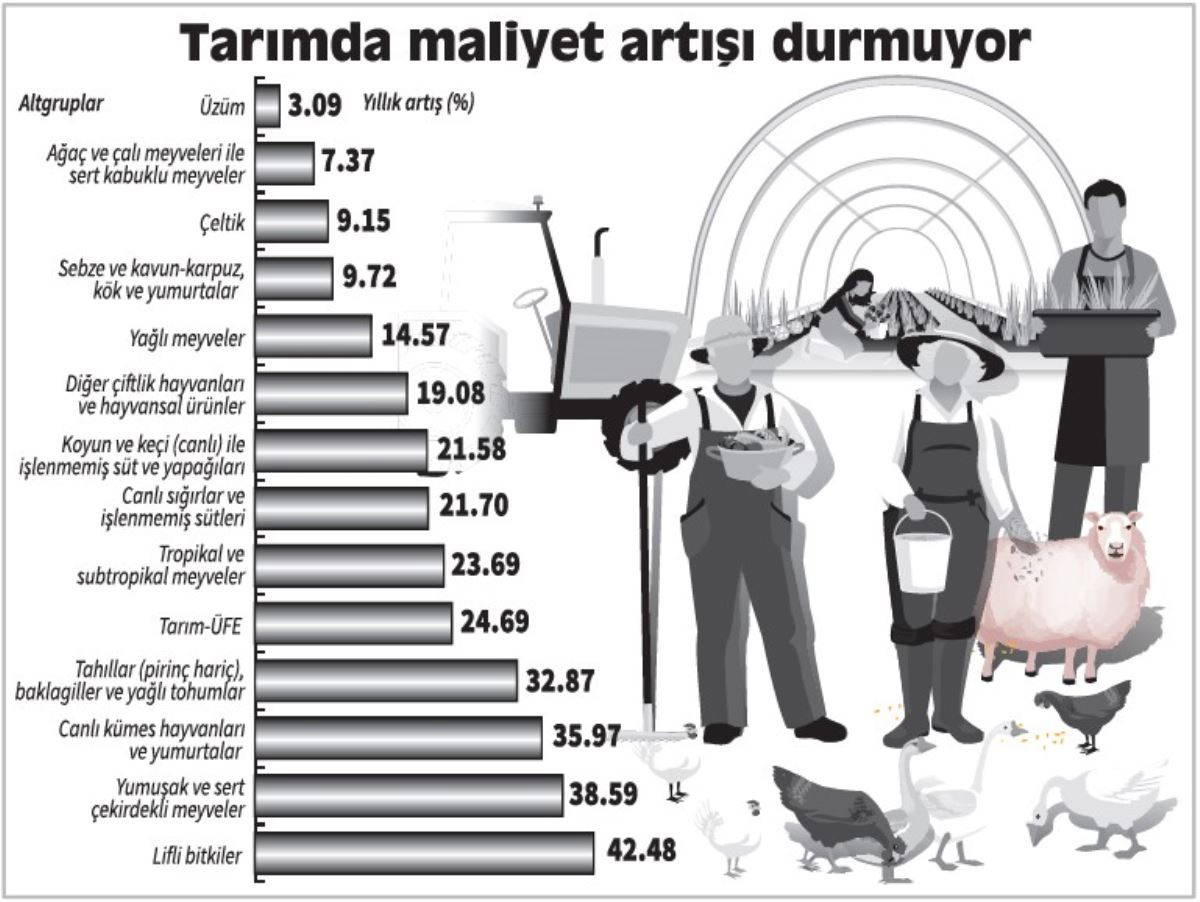 Aylık en fazla artış yüzde 9.33 ile canlı kümes hayvanları ve yumurtalar alt grubunda gerçekleşti. Bu gruptaki yıllık artış yüzde 35.97 oldu. Kümes hayvanları grubundaki maliyet artışının nedenini elektrik ve kömüre gelen zamlara bağlayan Türkiye Kanatlı Hayvan Eti Üreticileri Merkez Birliği (TÜKEBİR) Başkanı Abdullah Koç, ana girdi kalemlerinde zamların durulmadığını söyledi. 14 bin 200 üretim tesisinden 2 bin 100 tanesinin kapandığını söyleyen Koç, “Elektrik, kömür ve talaş bizim ana girdilerimizdir. Elektrikteki zamları bütün Türkiye konuşuyor zaten, önümüzdeki ay yine zam bekleniyor. Geçen yıl 90 kuruşa aldığım kömürü bu yıl 2 lira 10 kuruşa alıyorduk. Geçen hafta 2.40 kuruş oldu. Talaşın kilosunu 3-4 ay önce 75 kuruşa alıyorduk, şu anda 1 lira 30 kuruş oldu” diye konuştu.