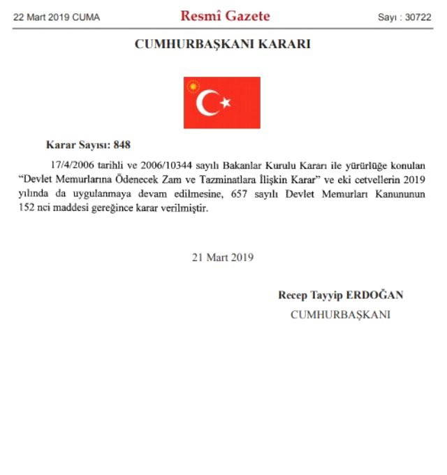 Buna göre, Devlet Memurlarına Ödenecek Zam ve Tazminatlara İlişkin Karar ve eki cetvellerin 2019 yılında da uygulanmaya devam edilmesine karar verildi.