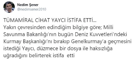 "Yakın çevresinden edindiğim bilgiye göre; Milli Savunma Bakanlığı’nın bugün Deniz Kuvvetleri’ndeki Kurmay Başkanlığı’nı bırakıp Genelkurmay’a geçmesini istediği Yaycı, düzmece bir dosya ile haksızlığa uğradığını belirterek istifa etti."