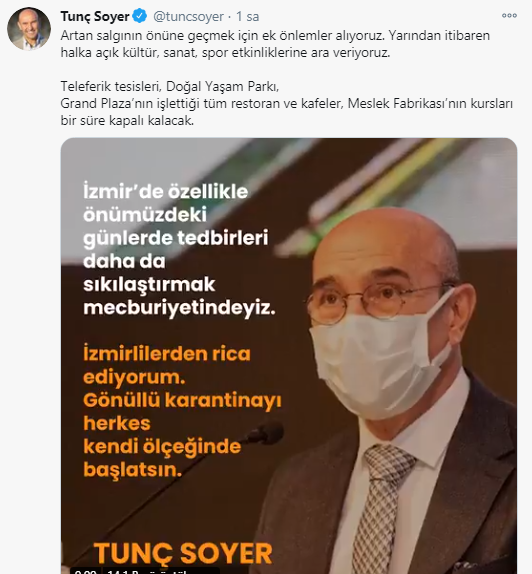 Soyer, alınan kararlarla ilgili yaptığı açıklamada, “Artan salgının önüne geçmek için ek önlemler alıyoruz. Yarından itibaren halka açık kültür, sanat, spor etkinliklerine ara veriyoruz. Teleferik tesisleri, Doğal Yaşam Parkı, Grand Plaza'nın işlettiği tüm restoran ve kafeler, Meslek Fabrikası'nın kursları bir süre kapalı kalacak” dedi.