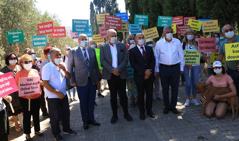 Alanda bulunan halk ellerindeki pankartlarla Başkanlara destek oldu, 'Doğaya asfalta hayır', 'Birleşe birleşe kazanacağız' slopaganları atarak go-kartı ıslıklarla protesto etti.