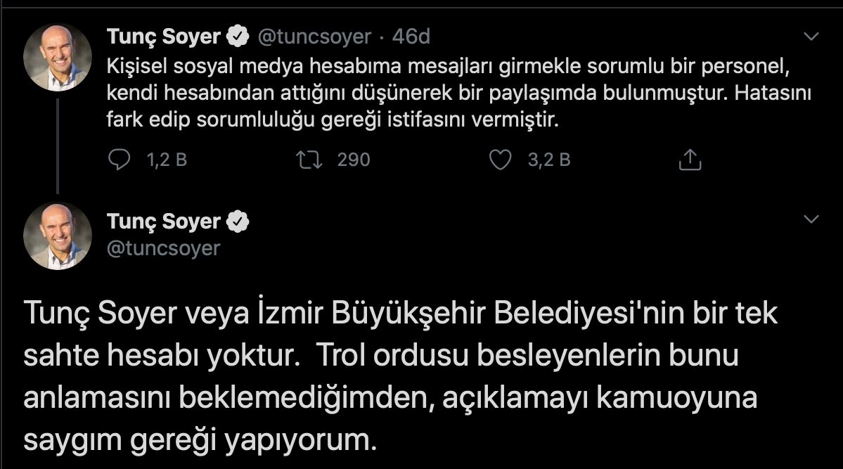 İzmir Büyükşehir Belediye Başkanı Tunç Soyer’in sosyal medya hesabının mesajlarını girmekle sorumlu çalışan, kendi hesabı sanarak başkanın hesabından bir mesaj yayınlayınca trollerin saldırısına neden oldu.