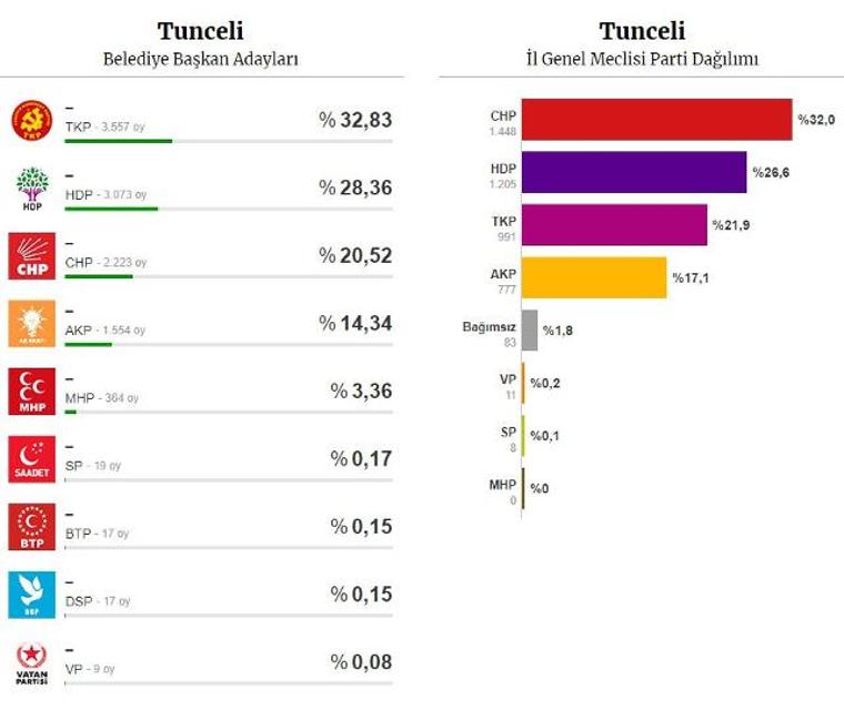 Türkiye Komünist Partisi'nin (TKP) adayı Fatih Mehmet Maçoğlu, %32,24 oy oranıyla Tunceli Belediye Başkanı seçildi.