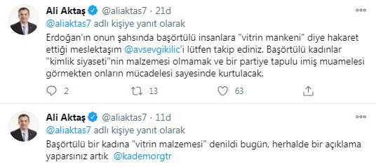"Başörtülü kadınlar "kimlik siyaseti"nin malzemesi olmamak ve bir partiye tapulu imiş muamelesi görmekten onların mücadelesi sayesinde kurtulacak." diyen Aktaş, AKP'ye yakınlığıyla bilinen, Erdoğan'ın kızı Sümeyye Erdoğan'ın da yönetiminde bulunduğu "kadın" kuruluşu KADEM'e de "Herhalde bir açıklama yaparsınız" diye çağrı yaptı.