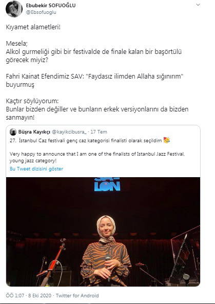 Kayıkçı'nın caz festivalinde finalist olmasını "kıyamet alameti" diye yorumlayan Sofuoğlu, "Kaçtır söylüyorum: Bunlar bizden değiller ve bunların erkek versiyonlarını da bizden sanmayın!" ifadelerini kullandı.