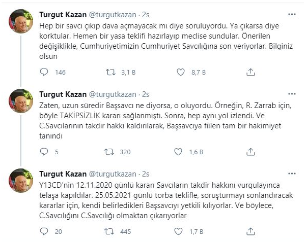 Ünlü hukuçu Turgut Kazan, sosyal medya hesabından yaptığı açıklada “Önerilen değişiklikle, Cumhuriyetimizin Cumhuriyet Savcılığına son veriyorlar. Bilginiz olsun” diye yazdı. Kazan, uzun süredir Başsavcılığın Cumhuriyet Savcılığının önüne geçtiğini ve Cumhuriyet Savcılığının takdir hakkının kaldırılarak başsavcıya tam hakimiyet kazandırıldığını belirtti.