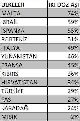 Bir yandan birçok tedbir alınıp turizm hareketliliği yakalanmak istenirken, diğer taraftan da aşılanmayanların hem içeride hem dışarıda güvensizlik oluşturduğunu kaydeden Başkan Yavuz, John Hopkins Üniversitesi verilerine göre turizmin kalbinin attığı Akdeniz ülkelerinin iki doz aşılanma oranlarındaki son durumunu şöyle paylaştı: