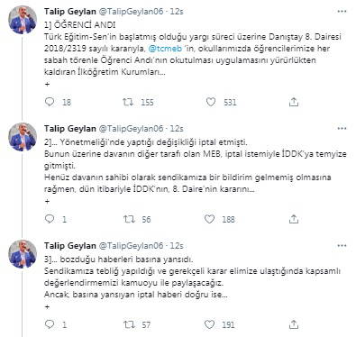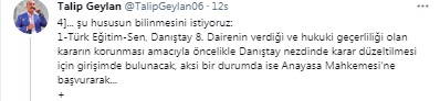 Türk Eğitim-Sen Başkanı Geylan, karar üzerine sosyal medya hesabı üzerinden yaptığı açıklamada, "Danıştay nezdinde kararın düzeltilmesi için girişimde bulunacaklarını, aksi bir durumda ise Anayasa Mahkemesi’ne başvurarak hukuki süreci sonuna kadar sürdüreceklerini" bildirdi.