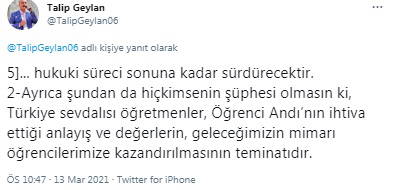 Geylan, "Hiç kimsenin şüphesi olmasın ki, Türkiye sevdalısı öğretmenler, Öğrenci Andı’nın ihtiva ettiği anlayış ve değerlerin, geleceğimizin mimarı öğrencilerimize kazandırılmasının teminatıdır" dedi.