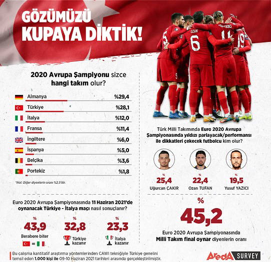 Araştırma şirketi Areda Survey, EURO 2020 müsabakası öncesi 1000 kişinin katıldığı bir araştırma gerçekleştirdi. Araştırmaya göre, Türk halkının yüzde 28,1’i A Milli Futbol Takımının Euro 2020 turnuvasında şampiyon olacağına inandığı kaydedildi. Katılımcıların yüzde 25,4'ü ise Trabzonspor'un kalecisi Uğurcan Çakır'ın turnuvaya damga vuracağını belirtti.