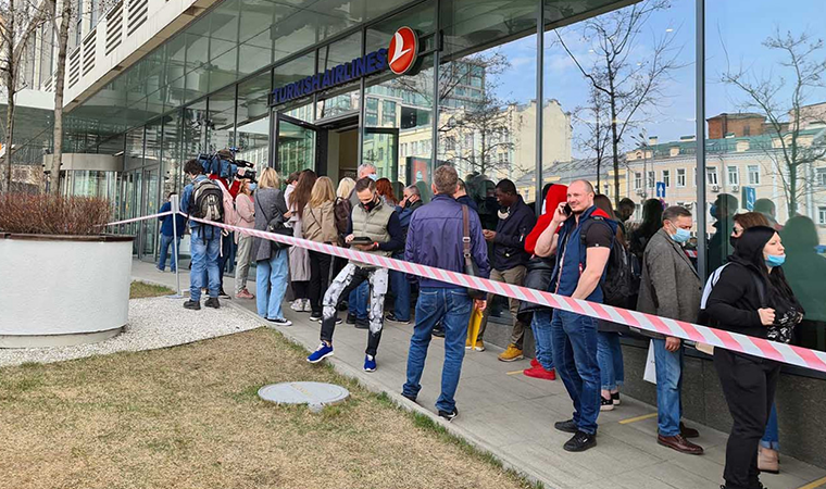 Rusya'nın 1,5 aylık uçuş sınırlamasının ardından, Moskova'daki THY ofisi önünde uzun kuyruklar oluşmaya başladı. Moskova 24 TV kanalı, canlı yayında kuyrukta bekleyenlerin sayısının dün öğleden sonra 200'e yaklaştığını duyurdu.