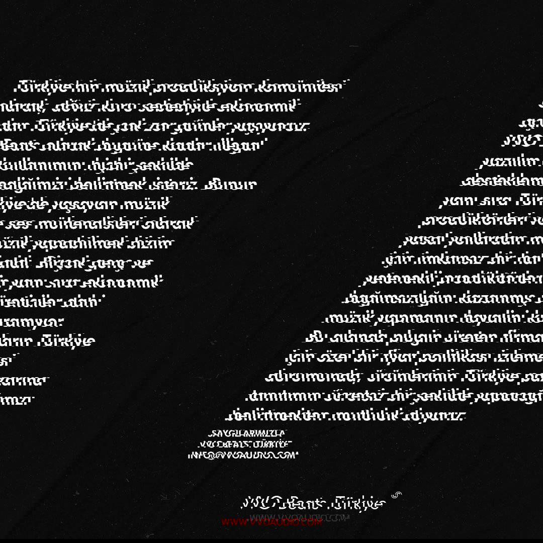 Türkiye'nin ilk hip-hop prodüksiyon platformu olan "VVO Beats Türkiye", sektörde hizmet veren küresel şirketler için bir çağrı akımı başlattı. Döviz kuruna bağlı olarak yükselen maliyetlere artık karşı koyamadıklarını söyleyen müzisyen ve ses mühendisleri, sektör devlerinden Türkiye için özel bir fiyatlandırma politikası istiyorlar. Ancak VVO Beats Türkiye üyeleri, bu talebin karşılıksız olmayacağını belirtip, seslerini duyan devlerin reklamlarını da ücretsiz olarak yapacaklarını ifade ediyorlar.