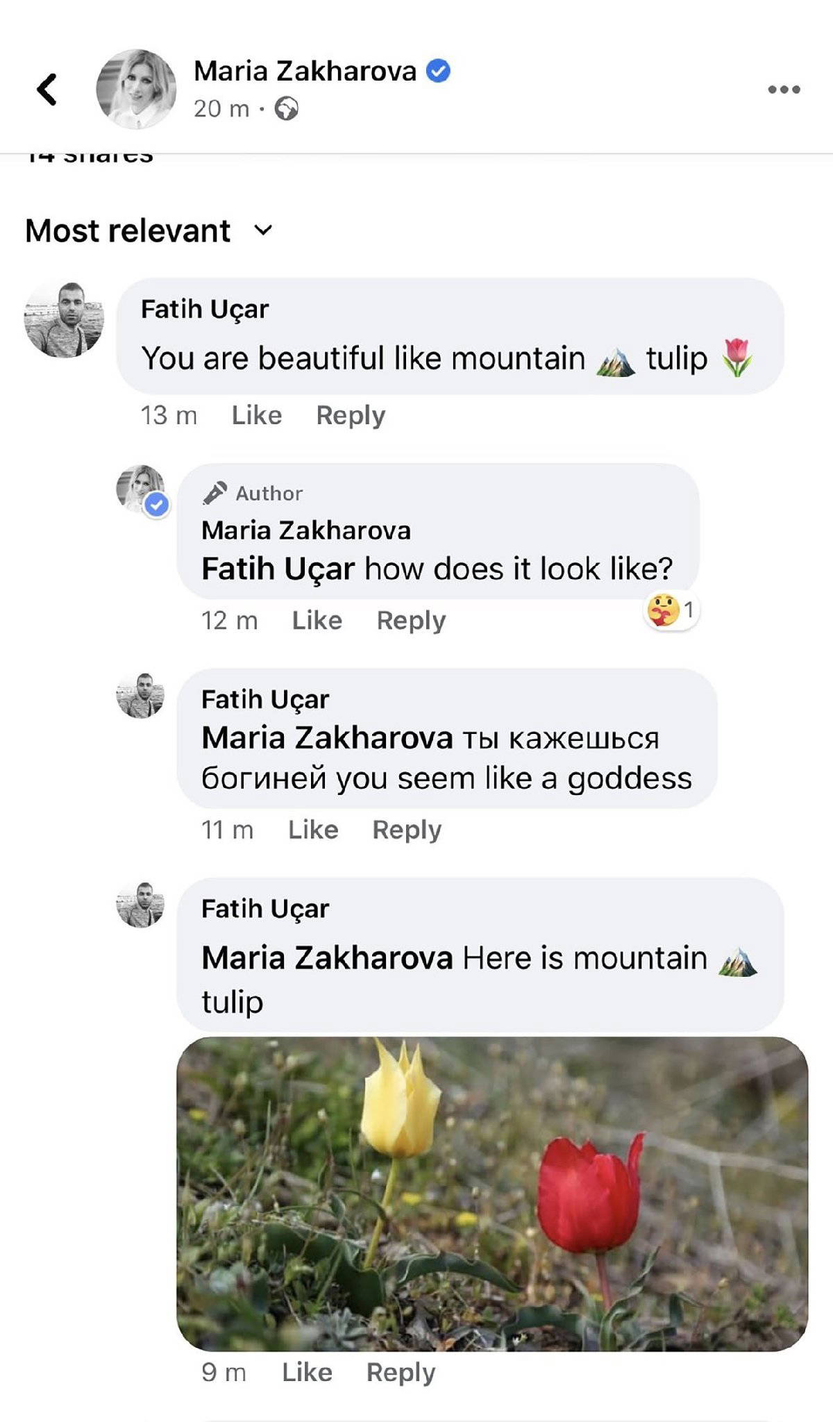 Zaharova'nın bu sorusuna cevap veren Fatih Uçar isimli Türk takipçisi dağ lalesi fotoğrafı paylaşarak Zaharova'nın sorusunu cevapladı. İkilinin sosyal medya üzerinden yazışması kısa sürede büyük ilgi topladı.