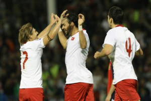 Ulusal Takımımızın atağında Gökhan Gönül sağ kanattan topla korner çizgisine indi ama topu ayağında kontrol edemeyince auta çıktı.