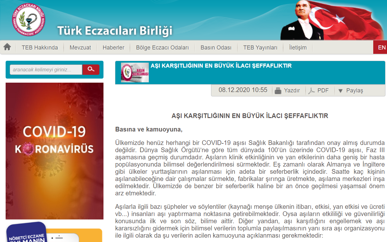 TEB, koronavirüs aşılarıyla ilgili ülkelerin menşeleri, etkisi ve ücretine ilişkin tartışmaların insanları aşı yaptırmama noktasına getirdiği uyarısında bulundu. Aşı karşıtlığı ve aşı kararsızlığının sadece aşı olmayan kişilerin hayatını riske atmayacağını, salgının devamına yol açacağı ifade edilen açıklamada, “Bu nedenle, birinci önceliğimiz aşı ile ilgili tüm süreçlerin topluma yönelik bir şeffaflık içinde gerçekleştirilmesi olmalıdır” ifadelerine yer verildi.