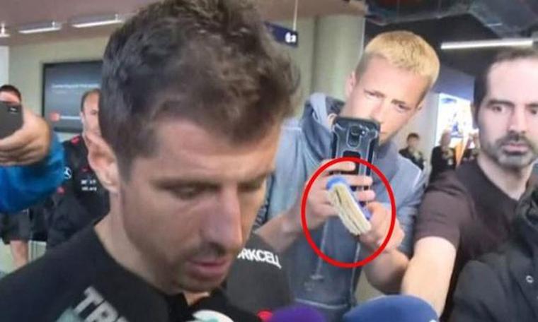 İzlanda'ya giden Türkiye Milli Takımı kâfilesindeki futbolcu Emre Belözoğlu'na gazetecilerin arasına karışan bir kişi tarafından mikrofon tutar gibi bulaşık fırçası uzatılmış ve bu görüntüler yoğun tepkilere neden olmuştu.