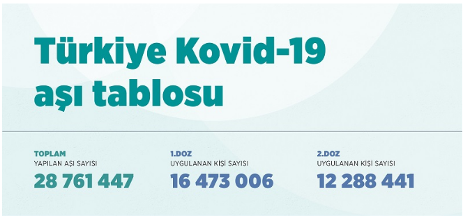 Buna göre; bugüne kadar 28 milyon 761 bin 447 doz Covid-19 aşısı yapıldı. 16 milyon 473 bin 006 kişiye ilk doz, 12 milyon 288 bin 441 kişiye de ikinci doz aşılar uygulandı.