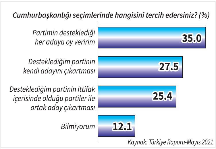Tam olarak böyle yorumlamam. Partilerin kendi tabanlarının çekirdekleri açısından bir sıkıntıları yok. Buradaki esas mücadele rakip partilerin memnuniyetsiz seçmeninin kendi tarafında çekebilmekte. Zaten eğer 2023’te yeni bir denge kurulacaksa bu dengenin esas belirleyicisi blok değiştirecek seçmen olacak. Yani iktidar blokundan muhalefet blokuna geçen seçmen. Sonuçlara baktığımızda katılımcıların yüzde 35’i ortak aday veya partilerinin kendi adayı fark etmeksizin partilerinin desteklediği her adaya oy vereceğini belirtti. Buna karşılık katılımcıların yüzde 28’i partilerinin kendi adayını çıkarmasını tercih ederken, yüzde 25’i ise ittifaklar çerçevesinde ortak aday çıkarılmasını tercih ettiğini belirtti. Mayıs ayı birinci anketi bulgularına göre katılımcıların yüzde 28’i destekledikleri partinin kendi adayını çıkarmasını tercih ediyor.