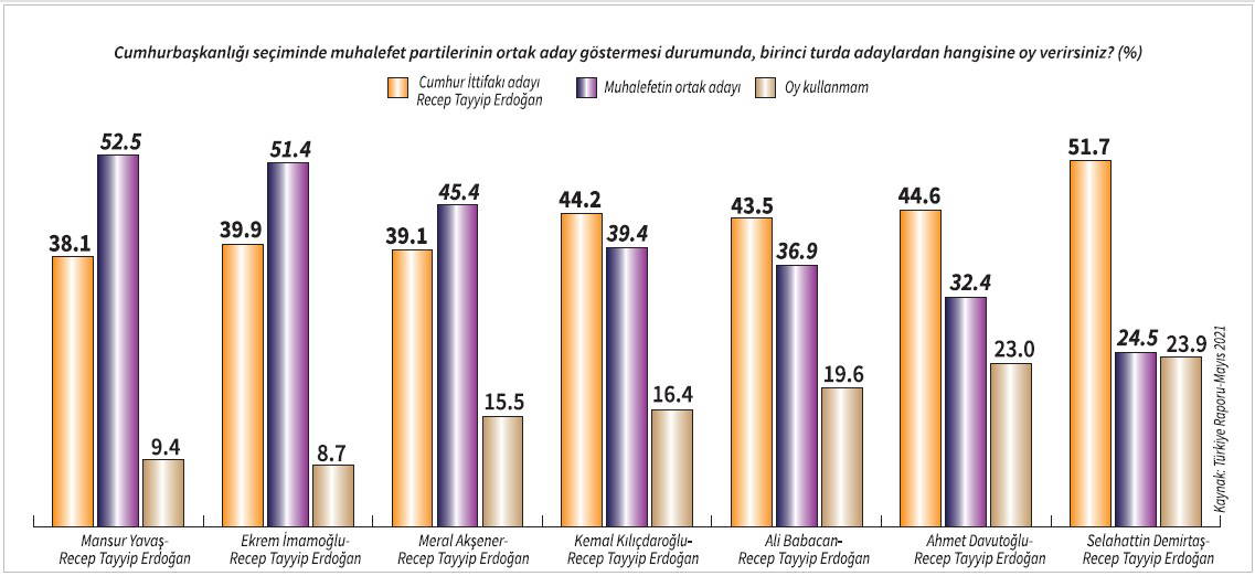 Bu sonuçlar, Cumhur İttifakı ve Cumhurbaşkanı Erdoğan’a olan destekte Eylül 2020’de başlayan düşüşün en üst noktaya ulaştığına işaret ediyor. Bundan birkaç ay öncesine kadar muhalefetin en büyük problemleri arasında aday olmaması konuşuluyordu. Ama görünen o ki artık bu değerlendirme geçerli değil. Potansiyel muhalefet adaylarının üçünün birinci turda Cumhurbaşkanı Erdoğan’dan daha fazla oy aldığı görülmektedir. Öte yandan bu üç adaydan ikisinin de Yavaş ve İmamoğlu, birinci turda Erdoğan karşısında yüzde 50’den fazla oy aldığı görülmektedir. Bu sonuçların değerlendirilmesinde “muhalefetin ortak adayı” kavramının seçmen gözünde HDP’nin dahli açısından ne anlama geldiğinin bilinmediği göz önünde bulundurulmalıdır. HDP’nin birinci turdaki tutumu için ben 3 farklı senaryo değerlendiriyorum. Bunlardan birincisi Selahattin Demirtaş gibi kuvvetli bir aday öne sürülür. Bu durumda muhalefetin geri kalanı ortak aday gösterse bile o adayın birinci turda yüzde 50’nin üzerinde oy alması muhtemel değil. İkinci senaryoda HDP daha düşük profilli bir aday göstererek seçmen kitlesinin bir kısmının muhalefetin ortak aday göstermesine vesile olabilir. Bu senaryoda ya muhalefetin ortak adayı yüzde 50’yi geçer ya da Cumhurbaşkanlığı seçimleri ikinci tura kalır. Üçüncü senaryoda ise HDP aday göstermez ve 31 Mart yerel seçimlerindekine benzer bir tablo ortaya çıkar. Bu stratejinin yerel seçimlerde işe yaradığını gördük. Ancak HDP’nin genel seçmen üzerindeki etkisi göze alındığında aynı dinamiklerin Cumhurbaşkanlığı seçimleri için geçerli olup olmayacağı konusunda yorum yapmak zor. Dolayısıyla bu isimlerin oy potansiyelini tartışırken muhalefetin aday belirleme stratejisinin ne olacağı ve HDP’nin bu stratejinin neresinde olacağı kilit önem taşıyor. Öte yandan birinci turda ortak aday senaryolarını tartışırken tek isim üzerinden gitmek yetersiz bir analiz alanı sağlıyor. Zira görünen o ki eğer ortak aday stratejisi benimsenirse o zaman muhalefet cumhurbaşkanı yardımcılarının da önceden açıklanacağı bir ekip ile kampanyasını yürütecek. Bunun etkisi daha farklı olacaktır.