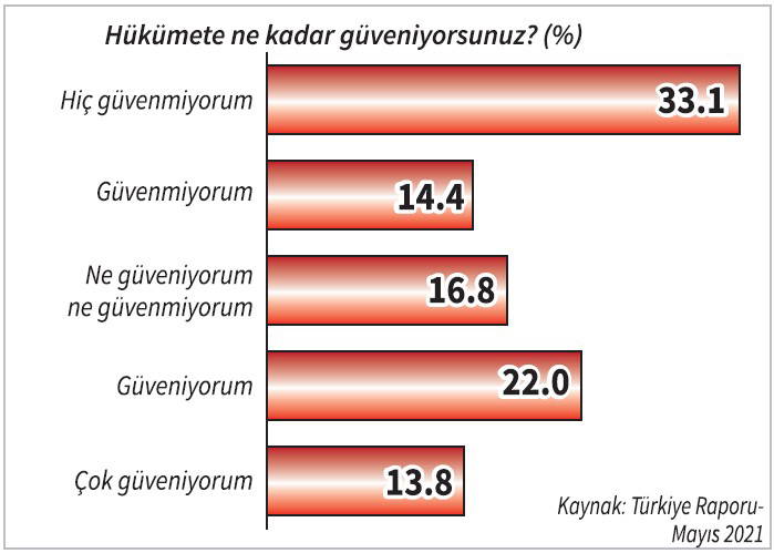 Ocak 2021 yılında aynı soruyu sorduğumuzda katılımcıların yüzde 44’ü hükümete güvenmiyorum/hiç güvenmiyorum cevabını verirken bugün bu oran yüzde 48 seviyesine çıkmış vaziyette. Ben bu artışı salgınla mücadeledeki eksiklikler ve ekonomideki gidişata bağlıyorum. Konulan yasaklara başta iktidar bloku siyasetçilerinin uymaması, geçen yılın son aylarında söz verilen aşıların bir türlü gelmemesi güvenin erimesinde etkili oluyor. Bu olanlar toplumdaki adalet duygusuna ciddi zarar veriyor.