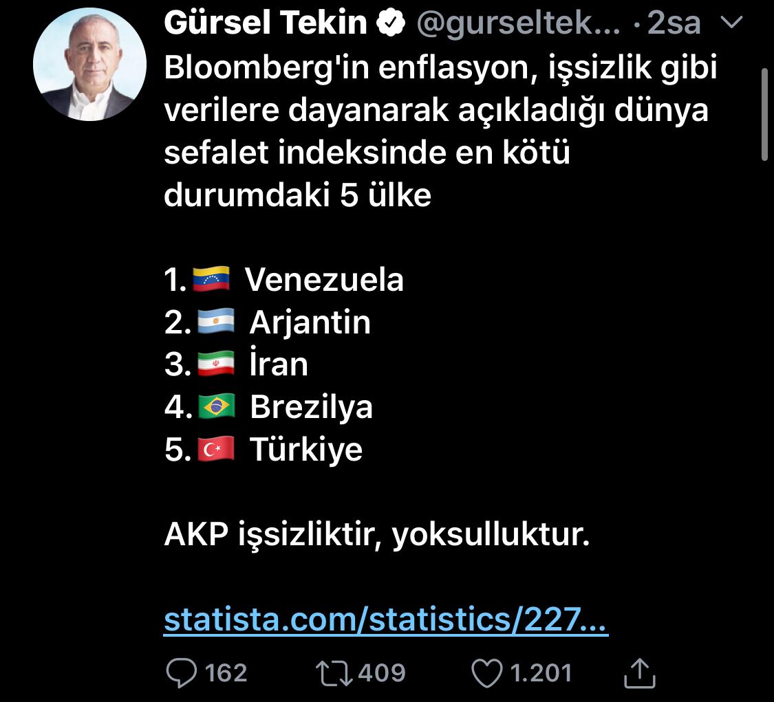 İndeksi sosyal medya hesabından paylaşan CHP İstanbul Milletvekili Gürsel Tekin, ''Bloomberg'in enflasyon, işsizlik gibi verilere dayanarak açıkladığı dünya sefalet indeksinde en kötü durumdaki 5 ülke. AKP işsizliktir, yoksulluktur'' ifadelerini kullandı.