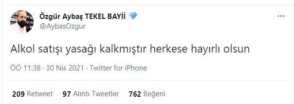 Türkiye Tekel Bayiler Platformu Başkanı Özgür Aybaş, Twitter hesabından yaptığı açıklamada, "Alkol satışı yasağı kalkmıştır, herkese hayırlı olsun" dedi. Aybaş'ın açıklamasının ardından İçişleri Bakanlığı 'alkol' ifadesi kullanmadan 'alkol satış yasağı'na işaret etti.