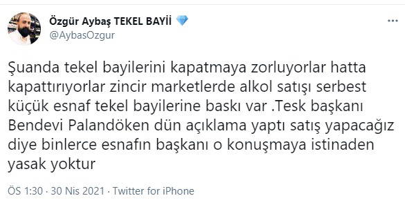 Bakanlığın açıklamasından sonra açıklama yapan Özgür Aybaş tekel bayilerinin kapatmaya zorlandığını aktararak, "Hatta kapattırıyorlar. Zincir marketlerde alkol satışı serbest, küçük esnaf tekel bayilerine baskı var. TESK Başkanı Bendevi Palandöken dün açıklama yaptı 'Satış yapacağız' diye. Binlerce esnafın başkanı o konuşmaya istinaden yasak yoktur" dedi.