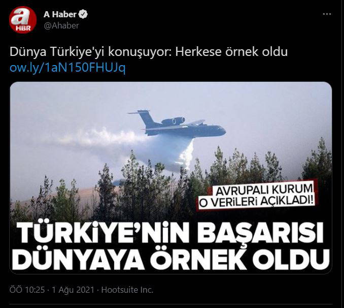 Türkiye'nin ormanları cayır cayır yanarken, insanlar ve yabani hayvanlar yaşamlarını yitirirken, yangın söndürme uçaklarının bilinçli olarak tasfiyesi gündemi meşgul ederken ahaber, internet sitesinde Türkiye'nin yangınlarla mücadelede dünya lideri olduğunu kurguladığı bir haberi yayına alıp servis etti.