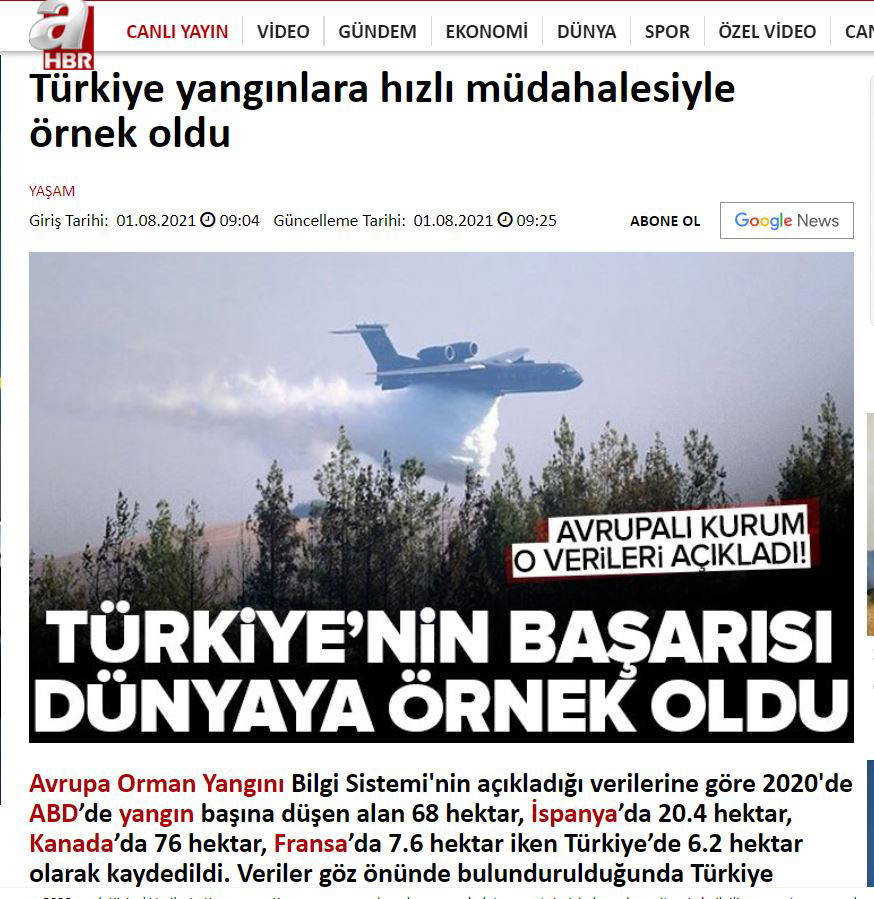 Haberde, "2020 yılında yangın başına düşen orman alanına ve müdahale sürelerine bakıldığında en başarılı ülke Türkiye oldu. Avrupa Orman Yangını Bilgi Sestemi verilerine göre, geçen yıl ABD'de yangın başına düşen alan 68 hektar, Kanada'da 76 hektar, İspanya'da 20.4 hektar, Fransa'da 7.6 hektar iken Türkiye'de 6.2 hektar olarak kayıtlara geçti. Diğer taraftan son günlerde birçok ülkeyi etkisi altına alan alevler hâlâ etkisini gösteriyor" denildi.