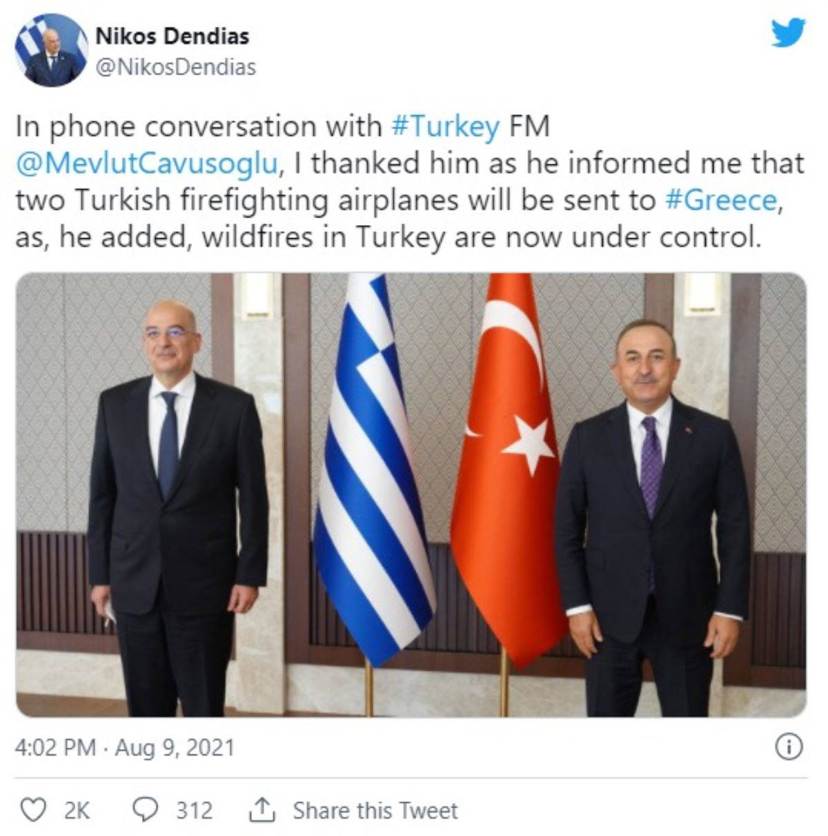 Dendias, Twitter hesabından yaptığı açıklamada "Türkiye Dışişleri Bakanı Mevlüt Çavuşoğlu gerçekleştirdiğimiz telefon konuşmasında bana Türkiye'deki yangınların kontrol altına alınmış olması nedeniyle iki Türk yangın söndürme uçağının Yunanistan'a gönderileceği bilgisini verdi ve kendisine teşekkürlerimi sundum" ifadelerini kullandı.
