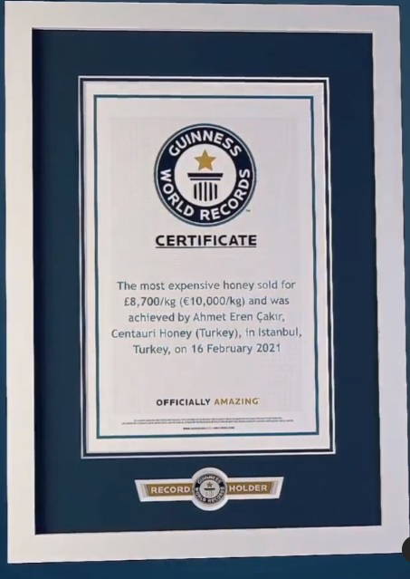 Lezzetiyle dünyaya nam salan Türk balı Guinness Rekorlar Kitabı'na girdi. Guinness Dünya Rekorları resmi internet sitesinde yer alan bilgilere göre, 16 Mart’ta Centauri balının, dünyanın en pahalı balı olarak rekorlar listesine girdiği ifade edildi. Rekorun kırıldığını doğrulamak için yapılan online görüşmesinde resmi bir hakemin, balın başarısının doğruladığı belirtildi.
