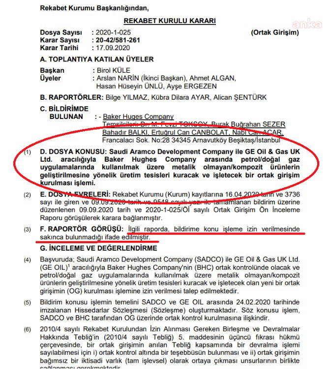 Rekabet Kurumu kayıtlarına 16 Nisan’da giren başvuru 9 Eylül’de onaylandı. 'Ortak Girişim Ön İnceleme Raporu' sonucunda, Saudi Aramco Development Company ile GE Oil & Gas UK Ltd. aracılığıyla Baker Hughes Company arasında petrol/doğal gaz uygulamalarında kullanılmak üzere metalik olmayan kompozit ürünlerin geliştirilmesine yönelik üretim tesisleri kurma ve işletecek bir ortak girişim kurulması başvurusu oybirliğiyle kabul edildi.