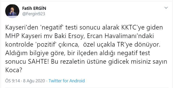 Ergin, ''MHP Kayseri mv Baki Ersoy, Ercan Havalimanı'ndaki kontrolde 'pozitif' çıkınca, özel uçakla TR'ye dönüyor. Aldığım bilgiye göre, bir ilçeden aldığı negatif test sonucu SAHTE! Bu rezaletin üstüne gidicek misiniz sayın Koca?'' dedi.