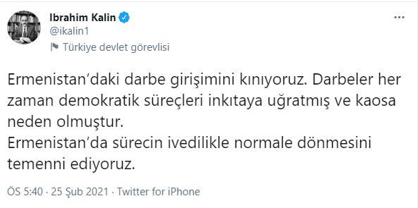 İbrahim Kalın, "Ermenistan'daki darbe girişimini kınıyoruz. Darbeler her zaman demokratik süreçleri inkıtaya uğratmış ve kaosa neden olmuştur. Ermenistan'da sürecin ivedilikle normale dönmesini temenni ediyoruz" ifadelerini kullandı.