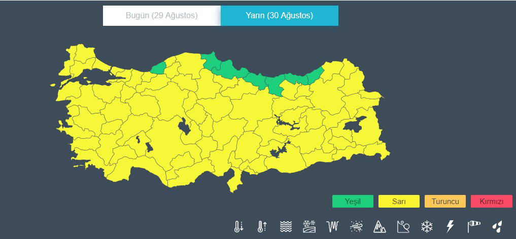 Meteoroloji bugün için yaptığı uyarıların ardından yarın için de 75 ile sarı uyarı yayınladı. Sinop, Samsun, Ordu, Giresun, Trabzon ve Rize’nin dışındaki iller için geçerli olan uyarıda hava sıcaklıkların yükseleceği ifade edildi.