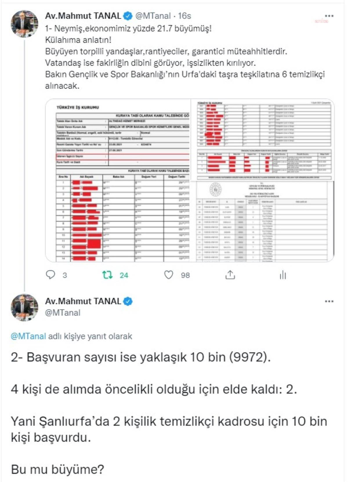 Şanlıurfa’da Gençlik ve Spor İl Müdürlüğü’nün İŞKUR üzerinden alacağı 6 kişilik temizlikçi kadrosuna yaklaşık 10 bin kişi başvurduğunu gösteren listeyi sosyal medya hesabı üzerinden yayınlayan Tanal, “Külahıma anlatın! Büyüyen torpilli yandaşlar, rantiyeciler, garantici müteahhitlerdir. Vatandaş ise fakirliğin dibini görüyor, işsizlikten kırılıyor” dedi.