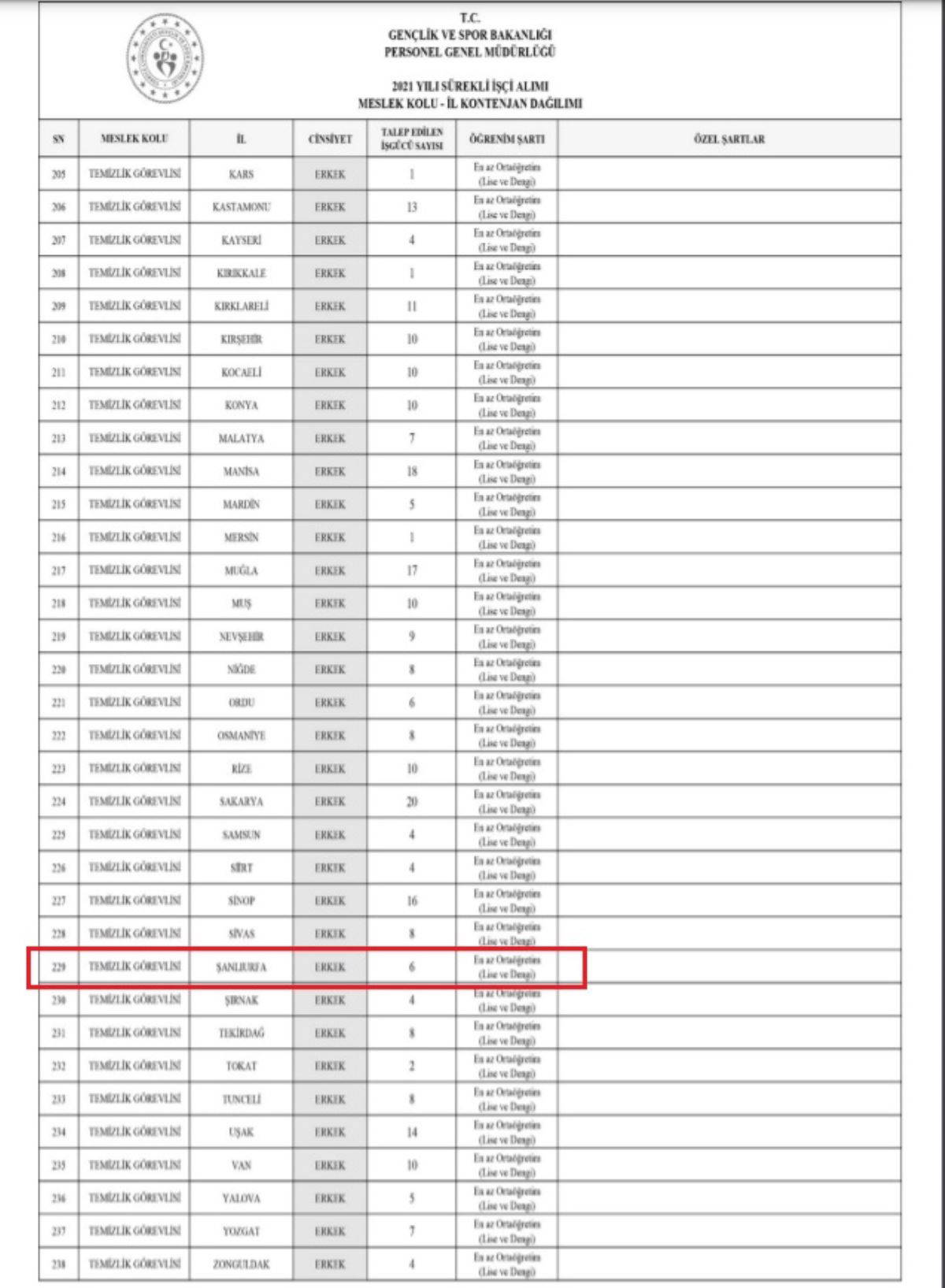 İşte bakın Gençlik ve Spor Bakanlığı’nın Şanlıurfa’daki taşra teşkilatına 6 temizlikçi alınacak.
