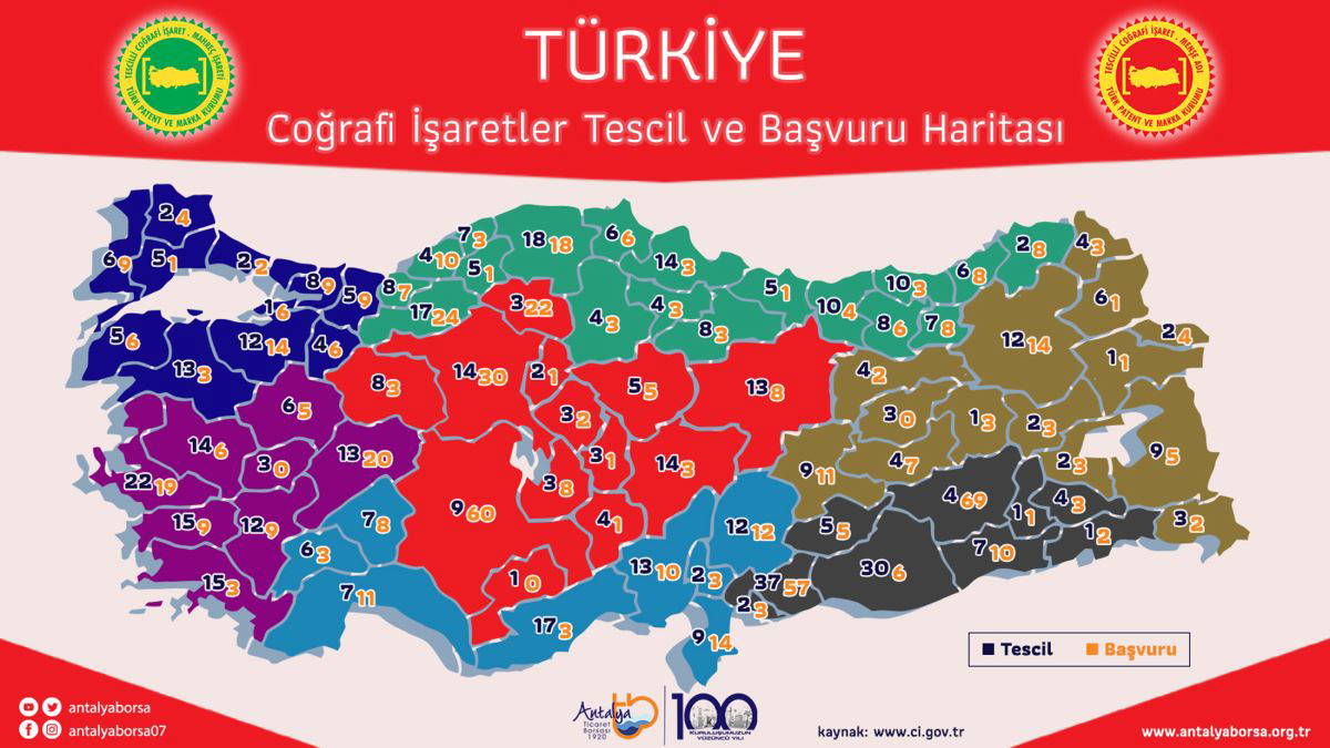 ATB Başkanı Ali Çandır'ın sosyal medya hesaplarından paylaştığı Türkiye'nin 7 bölgesine ait coğrafi işaretli ürünler ve coğrafi işaret başvurusu yapılan ürünlerle ilgili haritalara göre, en fazla coğrafi işaretli ürüne sahip bölge 143 yöresel ürünle Karadeniz Bölgesi. Diğer bölgeler sırasıyla Ege 100, Güneydoğu 91, İç Anadolu 82, Akdeniz 73, Marmara 63, Doğu Anadolu 62 yöresel ürün coğrafi işaretli.