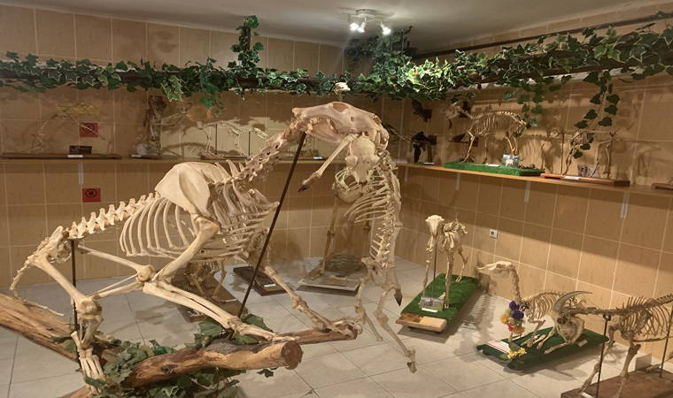 Bu bölümden bir dişi aslanın kemiklerinin sergilendiği bölüme geçiliyor. Ekim, aslanın öyküsünü “2011 yılında bir hayvanat bahçesinde ölen bu aslan, organları çıkartılarak kemikleri temizlendi. Kemikleri tek tek ayıklandı, kaynatıldı. Her bir kemiği tellerle birleştirilerek yapıştırıldı. 3-4 aylık bir sürecin sonucunda bugünkü halini aldı” sözleriyle anlatıyor. Aslanın ağzında ise ceylan kemikleri yer alıyor. Üniversite hastanesine gelen ancak kurtarılamayan ceylanın kemiklerini sergilediklerini anlatan Ekim “Bu ceylanın kemikleriyle de burada ceylan avlamış aslan konsepti oluşturduk” diyor. Bu bölümde deve kuçu, koyun gibi hayvanların kemikleri de yer alıyor.