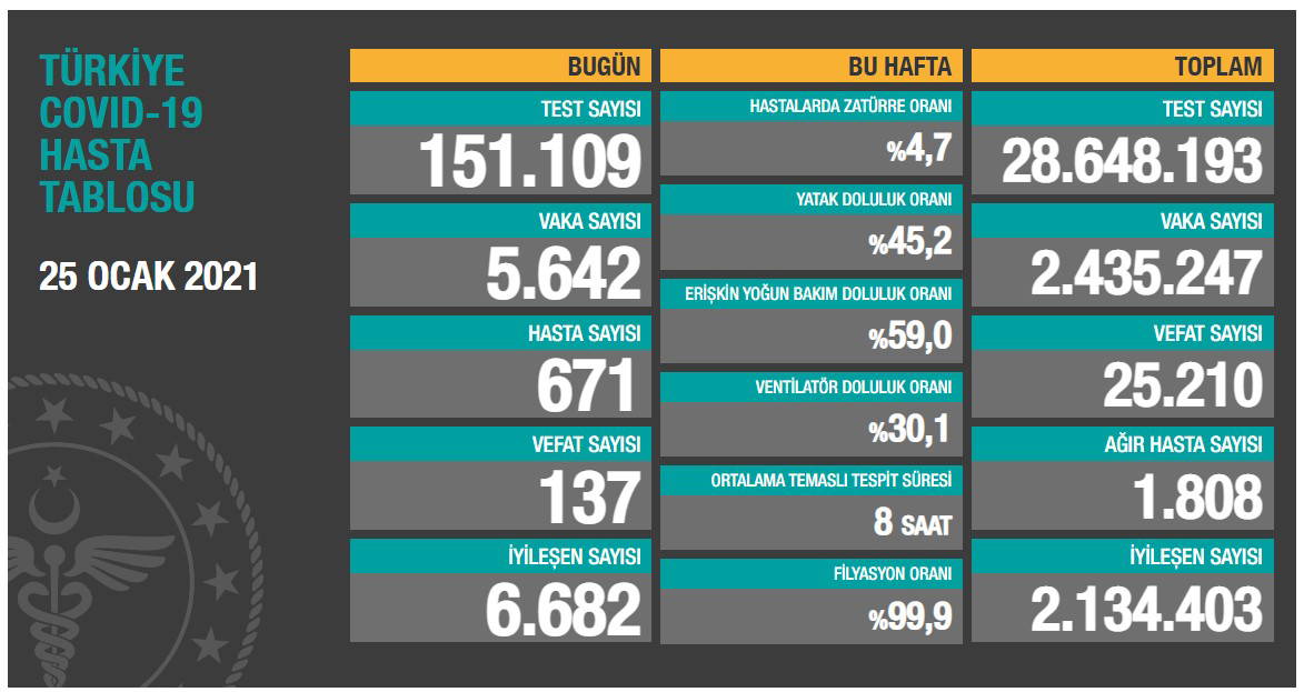 Türkiye'nin 25 Ocak 2021 güncel koronavirüs tablosu şöyle: