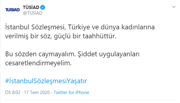 TÜSİAD'ın resmi sosyal medya hesabından yapılan açıklamada, İstanbul Sözleşmesi, Türkiye ve dünya kadınlarına verilmiş bir söz, güçlü bir taahhüttür. Bu sözden caymayalım. Şiddet uygulayanları cesaretlendirmeyelim. İstanbul Sözleşmesi yaşatır" denildi.