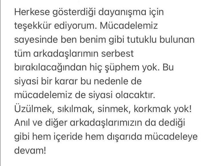 Bakırköy Cezaevi'nde avukatları tarafından ziyaret edilen Buldağ, arkadaşlarına mesaj gönderdi. Buldağ, "Herkese gösterdiği dayanışma için teşekkür ediyorum. Mücadelemiz sayesinde ben, benim gibi tutuklu bulunan tüm arkadaşlarımın serbest bırakılacağından hiç şüphem yok. Bu siyasi bir karar. Bu nedenle de mücadelemiz de siyasi oacaktır. Üzülmek, sıkılmak, sinmek, korkmak yok. Anıl ve diiğer arkadaşlarımızın da dediği gibi hem içerde hem dışarda mücadeleye devam!"