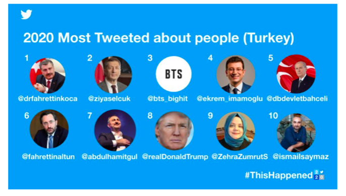Açıklanan verilere göre Türkiye’de Twitter'ın 2020 sohbetlerinde adı en çok geçen isim Sağlık Bakanı Dr. Fahrettin Koca oldu. Sağlık Bakanı ayrıca 4 milyonun üstünde yeni takipçiyle, takipçi sayısı en çok artan isim oldu.