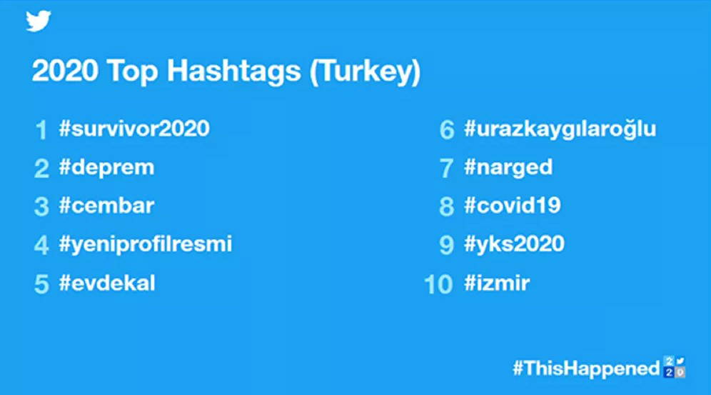 Türkiye'nin 2020 yılında en çok kullandığı hashtag'ler (etiket) listesinin birinci sırasında ise #survivor2020 yer alırken, pandemi dönemiyle birlikte kullanılmaya başlanan #evdekal hashtag’i de çok kullanılanlar arasına girdi.