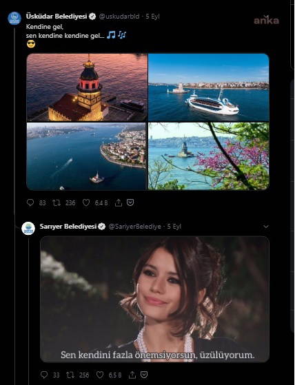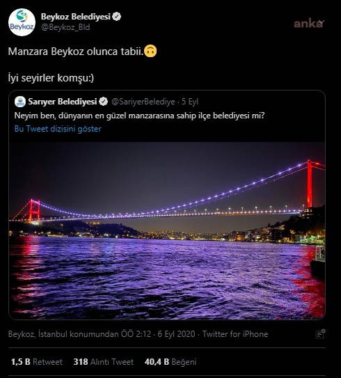 CHP'li Sarıyer Belediyesi akşam saatlerinde boğaz manzaralı bir fotoğraf paylaşarak altına “Neyim ben, dünyanın en güzel manzarasına sahip ilçe belediyesi mi?” paylaşımına, AKP’li Beykoz Belediyesi “Manzara Beykoz olunca tabii. İyi seyirler komşu:)" yanıtını verdi.