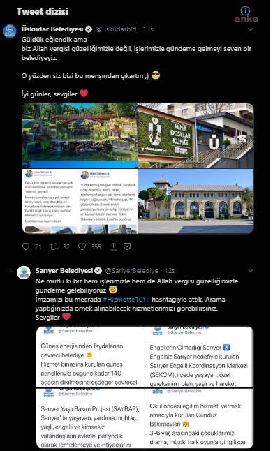 3 belediye arasında başlayan ve beğeni yağmuruna tutulan atışma, Üsküdar Belediyesi’nin “Güldük eğlendik ama biz Allah vergisi güzelliğimizle değil, işlerimizle gündeme gelmeyi seven bir belediyeyiz. Sevgiler” tweeti ve buna karşılık Sarıyer Belediyesi'nin “Ne mutlu ki biz hem işimizle hem da Allah vergisi güzelliğimizle gündeme gelebiliyoruz. İmzamızı bu mecrada 'Hizmette 10 yıl' hashtagiyle attık. Arama yaptığınızda örnek alınabilecek hizmetlerimizi görebilirsiniz. Sevgiler” tweetiyle son buldu.