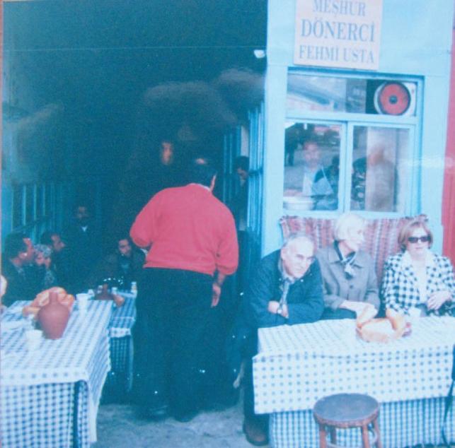 Çengelhan’ın 2001’deki giriş kemeri ile ilerideki han kapısı ve Fehmi Usta’nın dükkânı önünde döner bekleyenler.